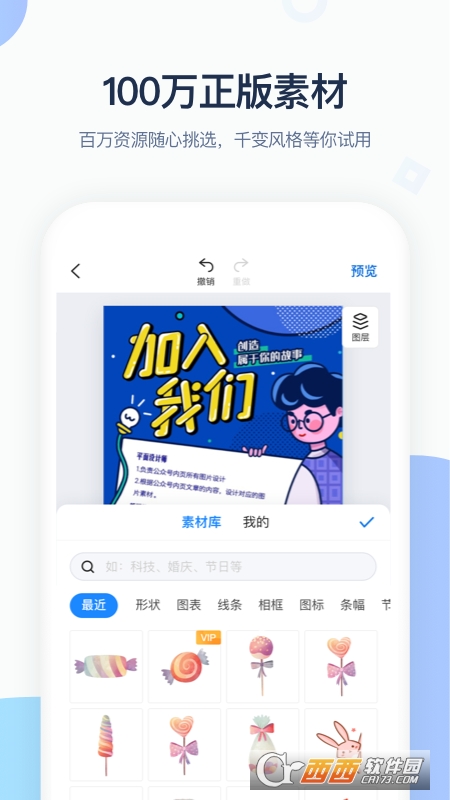 海报、h5制作、视频等设计模版应有尽有,千万款设计素材,细致到版式、图片、字体、音乐等正版素材。