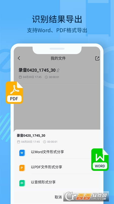 随声记是一款支持实时语音转文字、录音、外部音频转写的软件。我们只需要将所需识别的音频文件导入到app内就可转写成文字,还可支持边录音边精准的转成文字,同时我们支持将转写完成的音频以PDF或Word形式导出。此App是您学习、工作、生活中的必备软件,提升日常工作及学习效率,便捷高效的帮您解决转文字问题。