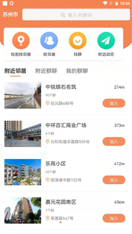 2,不同类型的附近群聊模式都是依据网络数据进行更新的,所有的数据都可以及时进行同步,各种小区的距离和位置都可以上传,服务用户和邻居进行互动交流。