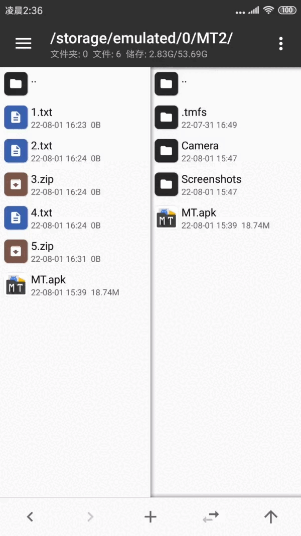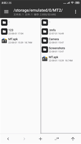 进入 MT 管理器,首先看到的是左右两个文件列表窗口。