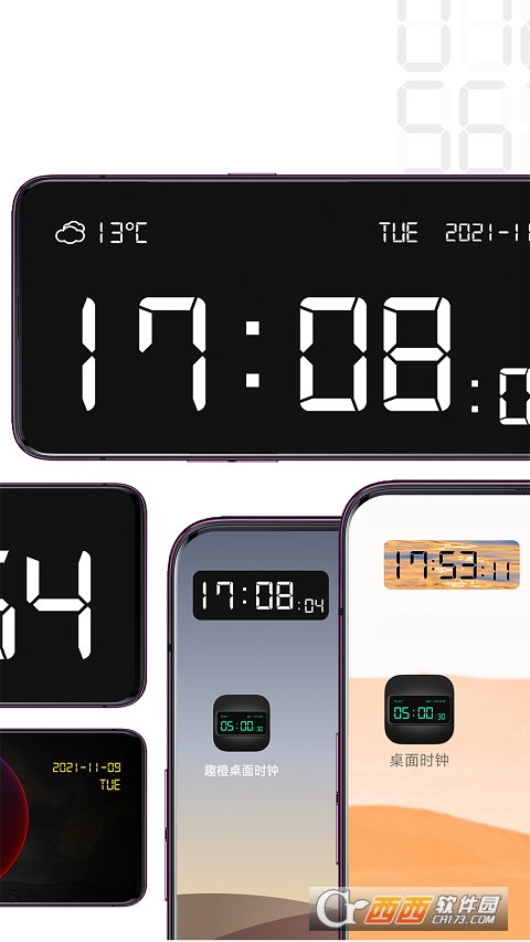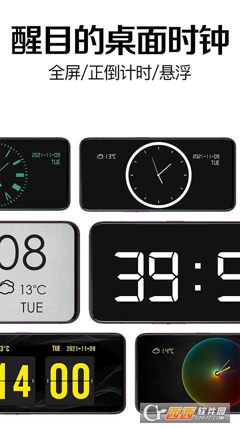换个喜欢的皮肤,会不会更喜欢打开App,迫不及待开始今天的任务呢?科技、星空、自然、艺术、复古、四季、暗黑、清新等各种风格及分类的数字时钟和模拟时钟皮肤,等你来挑!