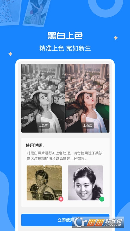 全能修复老照片app利用尖端的人工智能技术,可以将模糊、老旧、清晰度低的照片进行高清还原修复,同时还可以对黑白照片进行上色,让尘封许久的回忆添上一份色彩!