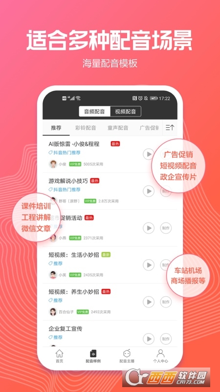 3、多场景配音模板:提供商业广告配音、政企宣传片配音、彩铃配音等多种tts配音场景模板