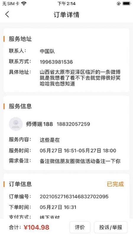 服务完成双方可以进行评价,通过软件的所有订单都会记录好;
