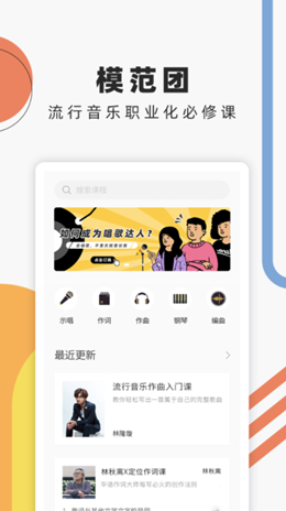 2,通过独特的模式设计了全新的大师课程内容,各种专业的分类模式进行了优化和严谨的管理模式,包括作词、作曲以及演唱和演奏四个方向,让用户自己可以学习适合自己的模块。
