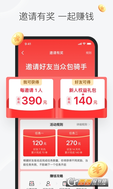 美团众包是专门为兼职人群打造的专业的兼职配送赚钱工具,依托于美团外卖,每天有超过2000万配送订单等您配送,让您成为用户和商家的兼职送餐骑士,自己创业的老板!海量兼职配送订单等你来,轻松送餐,月入过万!更有多重活动,对兼职及送餐助力!平台长期保持兼职专职骑手招聘活动,注册即可开始进行配送兼职工作,单单结算,让您随时随地开赚,自我掌控时间!你是不是有一些时间,闲着也是闲着? 有些商家有很多订单需要有人把它送到消费者手中,却苦于找不着人。 美团众包,正是这样一款应用,连接你和商家,只需轻松完成注册,就可查看到你附近需要完成的任务。自由接单,月入数千元。从此,做自己的老板,为自己安排工作时间。