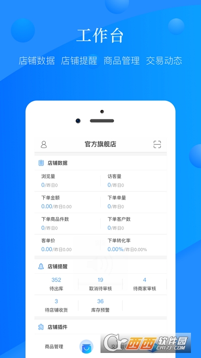 1.工作台:展示店铺关键数据,如:浏览量、访客数、下单金额、下单量、下单商品件数、下单客户数、客单价、下单转化率;业务模块:商品管理,交易管理等快捷入口;