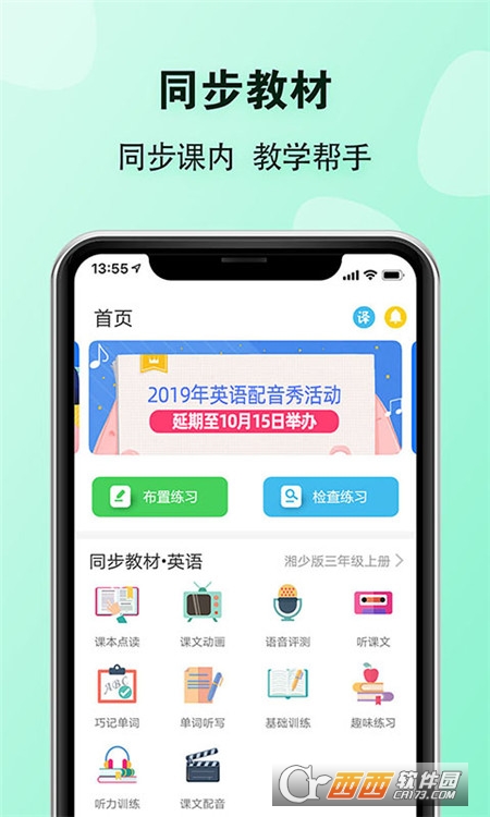 【同步教材】与湘少、湘鲁等诸多版本小学英语教材完全同步,包含课本点读、课文动画、听课文、口语训练、语音评测等模块,轻松完成教材主题学习;并配套单词听写、趣味练习、听力训练、小升初专项测试等模块,通过教师推荐功能,向学生推荐适合其学习和练习的内容。