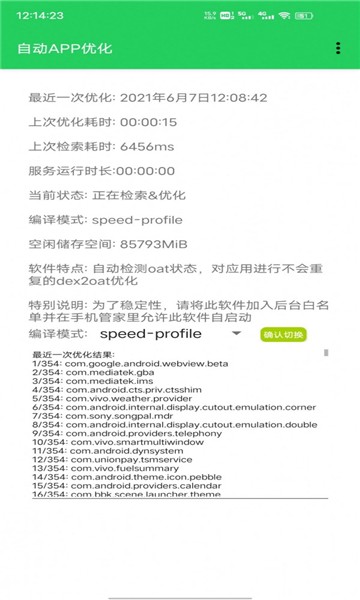 自动APP优化(编译模式)是一款应用运行自动优化工具,让你手机不再卡了,此软件能有效的提升软件的运行效率和流畅度,提升手机续航并降低手机温度。这软件基本实现了全自动,很棒的优化效率和速度,优化过的app不会被再次优化。