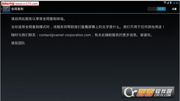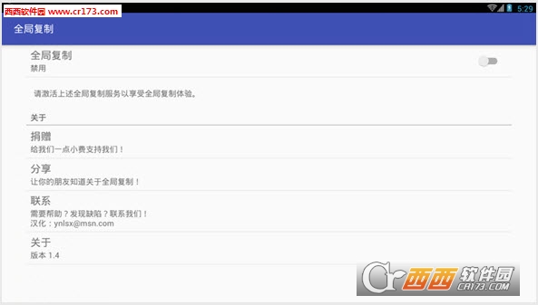 全局复制能够帮你复制想从一个应用中复制文本但是却不能使用安卓默认的长按功能进行操作?那么全局复制可以驱除这样的痛苦!激活全局复制模式并选择你想复制的文本,就是这么简单!轻松,简单,完全免费,无广告!