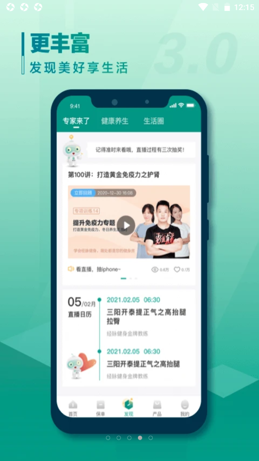 2)丰富功能:新增保单列表、客户服务中心预约、经脉健身四季行等功能,让您享受到更全面的线上服务。