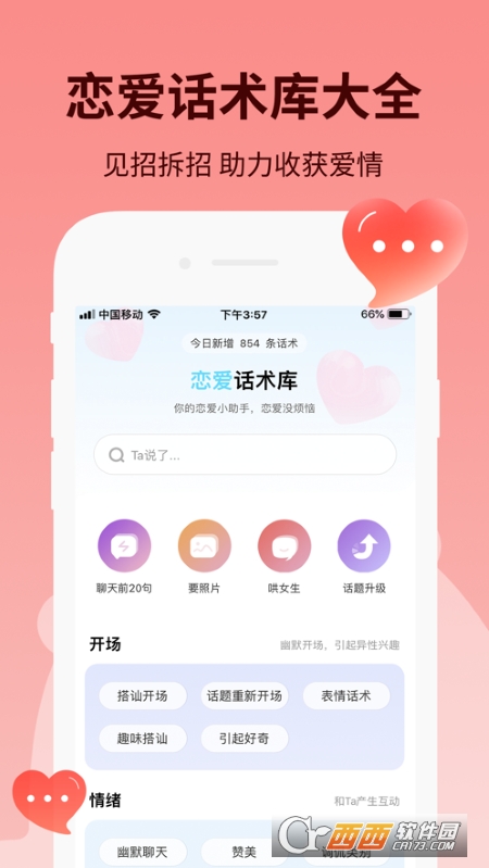 拥有完整的话术库,覆盖日常生活聊天全场景,使用快捷方便,一键复制自动搜索生成聊天话题和回复,还有各种恋爱攻略、脱单技巧、恋爱案例、舔狗日记等你来哦。