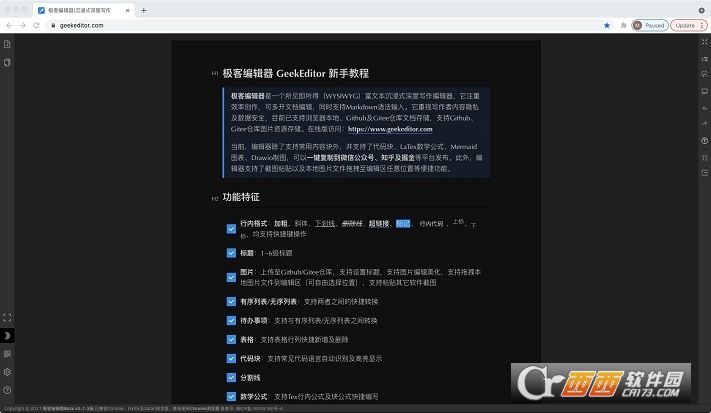 极客编辑器目前支持Mac、Windows以及网页三种客户端,用户可以任选自己所需要的客户端来完成文字上面的编辑,主打隐私和数据安全,在GitHub上面完全的开源,功能上面也是非常的完善,基本上文字上面的编辑需求都能够进行满足,需要的话就快来下载这款极客编辑器!