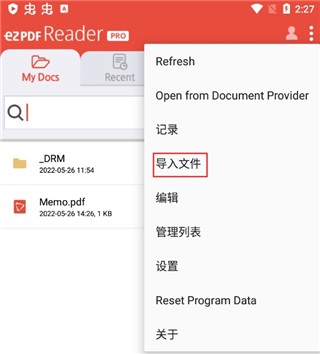 3、在弹出的下拉菜单中,包含:refresh、open from documrnt provider、记录、导入文件、编辑、管理列表、设置等。