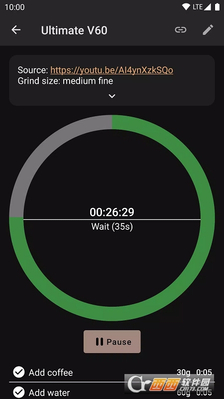 Cofi 是一款开源的咖啡冲煮应用其主要功能是进行冲煮计时,打开应用,应用默认给出了三种不同的冲煮方案。以其中的 V60 滤杯冲煮为例,Cofi 借鉴了 James Hoffmann 的冲煮方案。从加粉、闷蒸再到后两段注水的过程都给出了一个建议时间。我们需要做的就是根据应用给出的建议,按下计时开关后,加粉、注水。每一个环节结束后 Cofi 都会通过机身振动加声音的方式提醒我们,从而方便我们开展下一阶段的注水。
