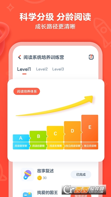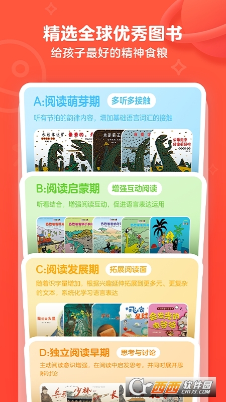 1、独创少儿分级阅读爬梯书库:从A~E阶一步步带领孩子从阅读萌芽期到独立阅读期,科学培养孩子终身阅读习惯;