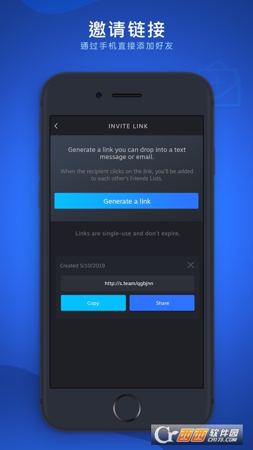 使用链接在steam上添加好友。生成邀请链接用于短信或电子邮件。