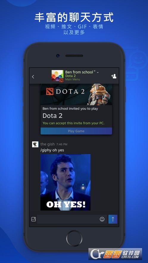 Steam聊天,专为与好友和群组聊天设计的轻便应用。丰富多彩的聊天方式使用视频、推文、GIF以及更多方式,随时重拾聊天。