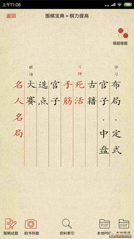 围棋宝典含大量精解专辑、棋谱、习题,是一款可以随时随地打谱,做题,学习,对弈(包括IGS即时对弈、非即时对弈、人机对弈),棋力测试,研讨的手机围棋软件;所有资料精挑细选,是谓宝典;均带有文字解说和分支变化图.