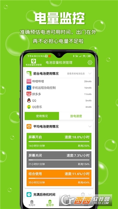 3、电量监控:对剩余电量提供使用时间预测,为您提供各单项功能的预测时间,准确预估电池可用时间,出门在外再不必担心电量不足啦。