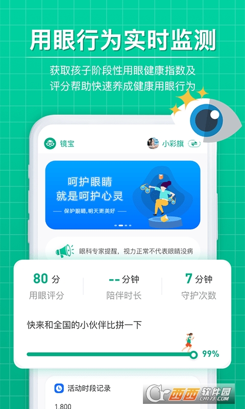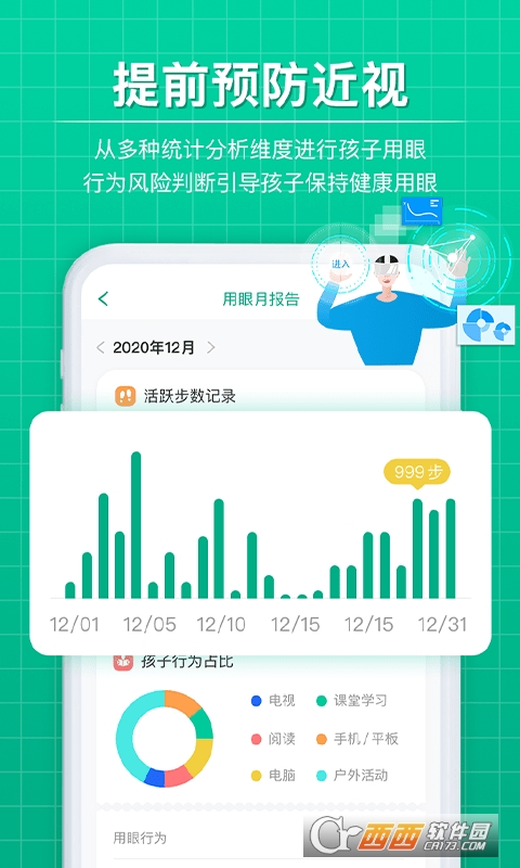1.智能生成儿童健康用眼周报、月报情况,了解每日/周/月的用眼波动趋势,及时改善孩子的用眼行为习惯,达到预防近视增长的目的。