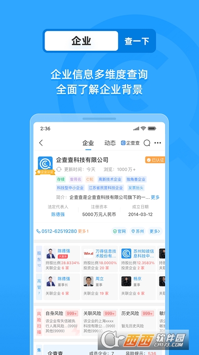 企查查企业查询平台是一款企业信息查询APP,在APP里随时随地可以查询企业信息。简单高效的企业查询平台。全方位了解企业的背景信息,了解更多企业资讯。有需要的快来鳄斗163手游网下载吧!