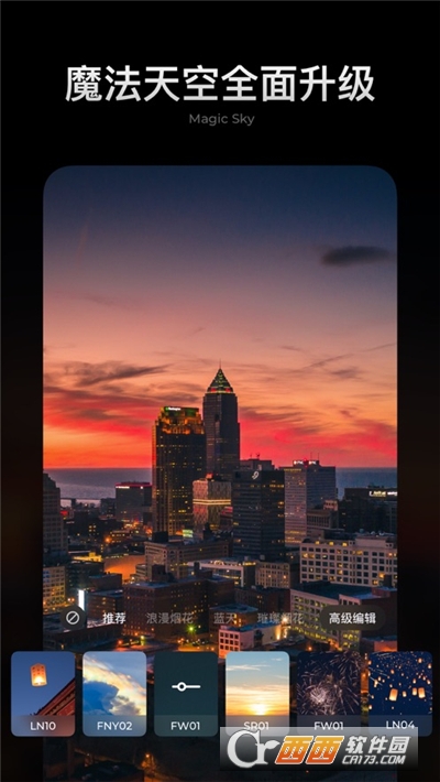 一键替换绚丽天空 ―― 200多款魔法天空滤镜,即便是阴天,也可以变的晴空万里,轻松实现任何你想像的场景。