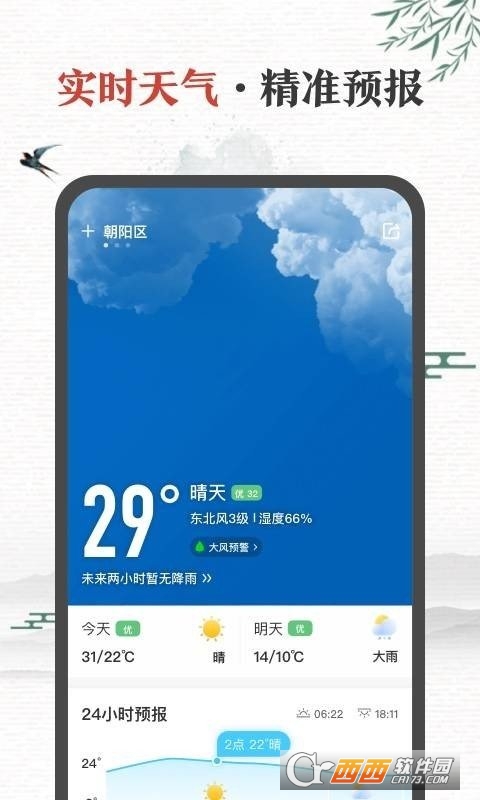 云天气:覆盖全国所有县级以上城市,连续6日天气温度趋势图,全面的生活指数、空指PM2.5解析;关注天气,我们倾力提供准确数据和健康建议,一起为生活在地球而战。