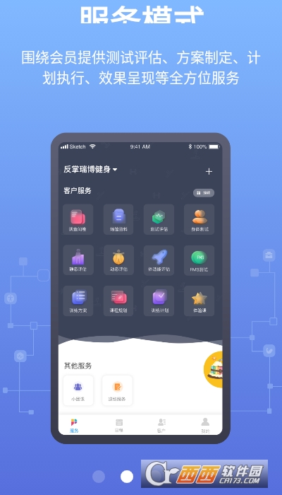 在服务模式中,我们具有调查问卷、身体测试、体适能评估、静、动态评估等功能,通过多个测试数据,生成精准的体测报告,通过微信小程序发送给会员,提高会员体验感、教练专业度的同时,也大大提高了会员的续课率。