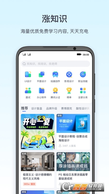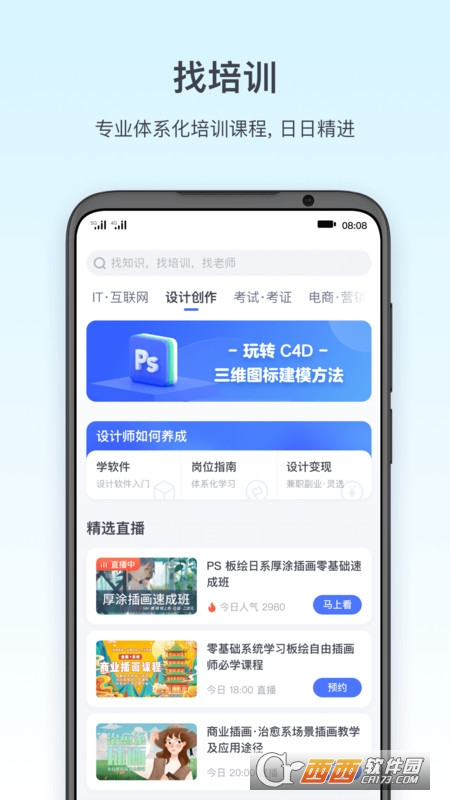 【设计】涵盖UI设计、室内设计、游戏美术设计、平面设计、设计软件、影视后期设计、服装设计、环境艺术设计、插画动漫等课程,更有大型机构BIGD大梦想远程培训、H2学院、拓者设计学院等。