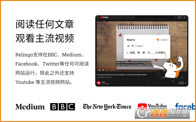 Relingo支持在BBC、Medium、Facebook、Twitter等任何可阅读网站运行,除此之外还支持 。Youtube 等主流视频网站。