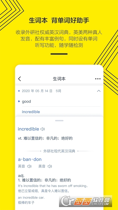 - 内置外研社权威英汉词典,英美两种真人发音,并列有丰富例句,音形义帮助学生记单词、学用法;同时设有选定单词听写功能