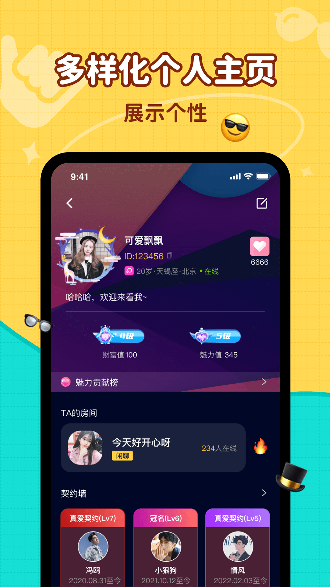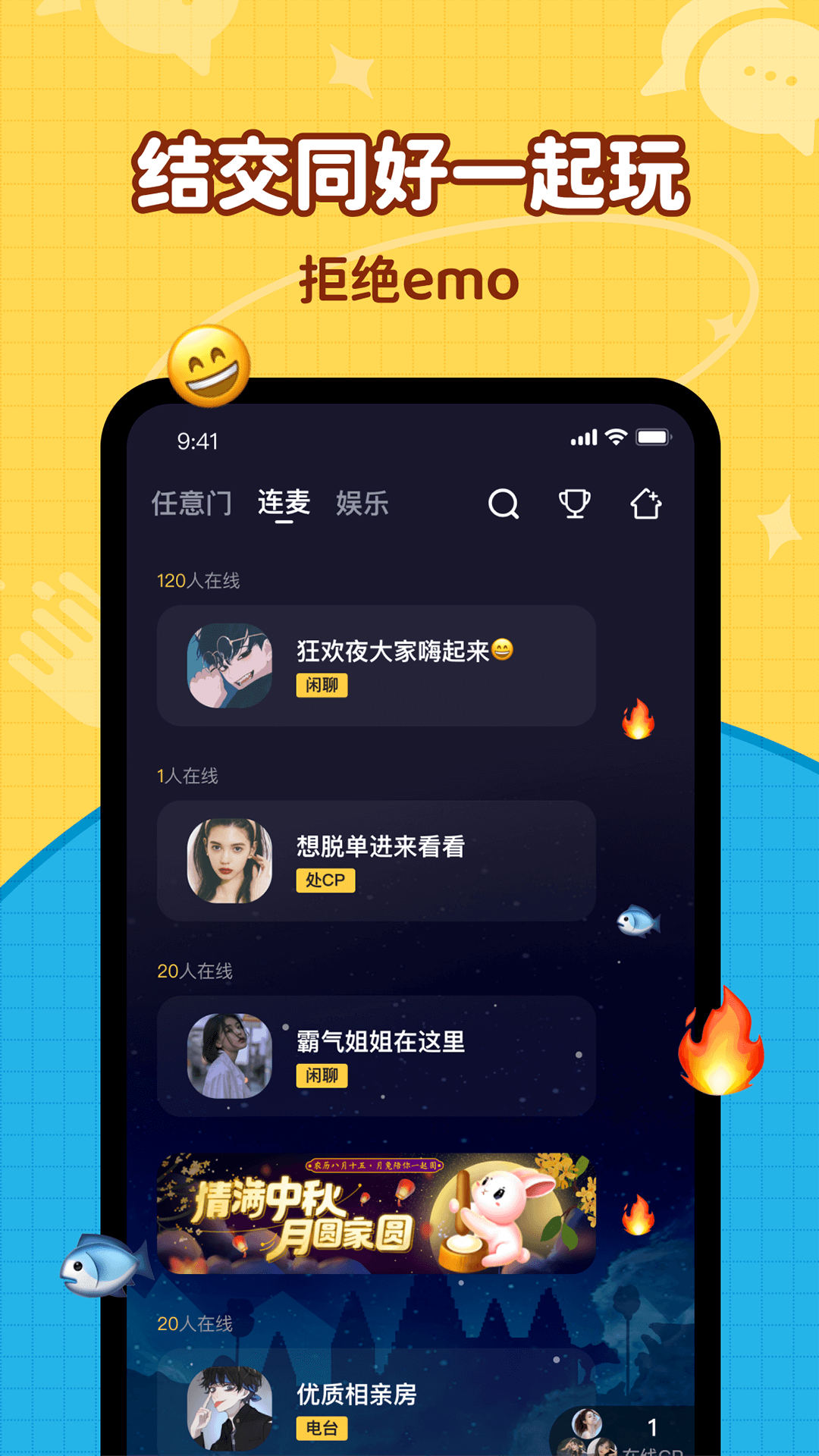 2、每天与趣味相投的人聊天,与心动女生连麦,多人pk娱乐。