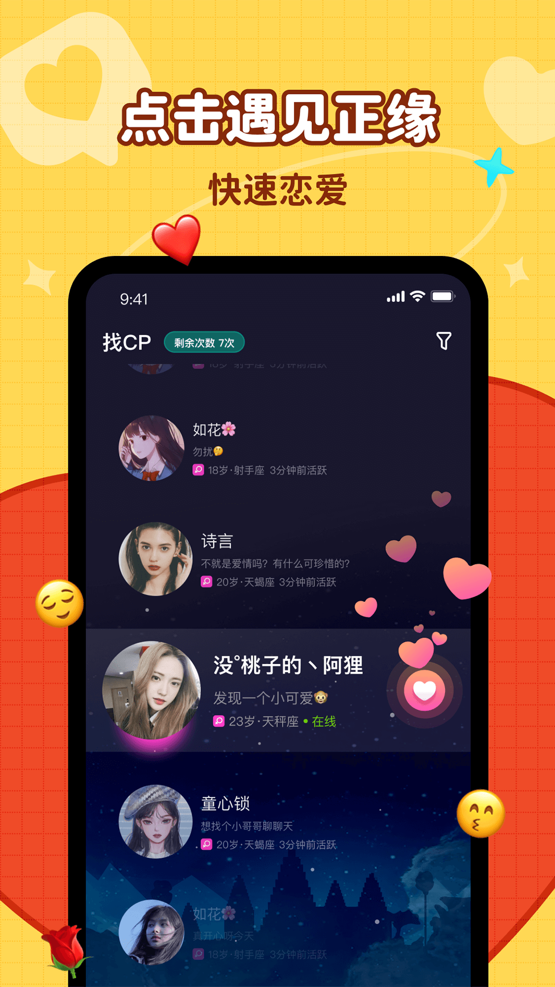 1、一键匹配与你聊得来的女生,高冷/热情类型的都有。
