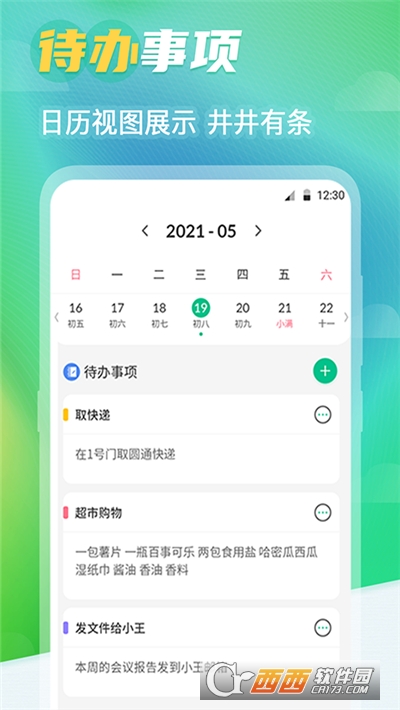 【待办事项】日程管理、备忘录、日程清单、工作清单、生活清单、节日礼物、生日提醒……生活中大大小小的事务都可记录到待办事项里,大忙人再也不担心会漏掉事情。