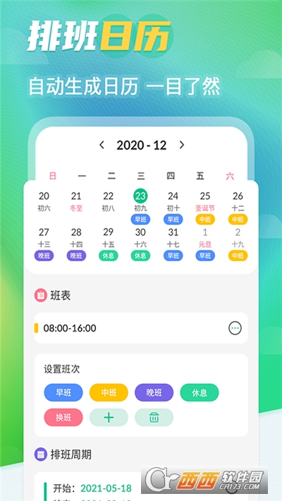【排班日历】根据自定义的排班周期、轮班表、班次时间生成排班日历,不同的班次颜色,让倒班轮班一目了然,省心方便。