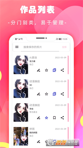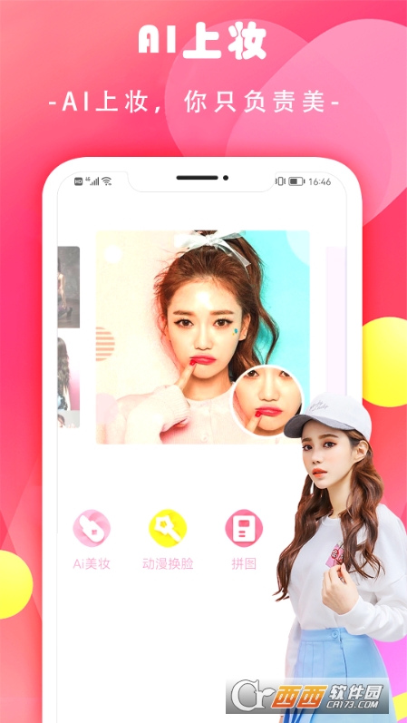 一款好玩的免费美颜换妆App,应用AI技术,精确识别出人脸关键部位(如眉、眼、鼻子、下巴、睫毛、嘴唇等),再结合视觉处理技术对这些部位进行修饰,让您不用化妆也能拍出满意的美图来。App具有以下主要功能: