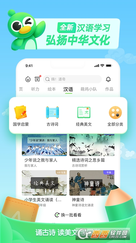 青少年在线趣味学英语平台,超过7000万家长、140万学校老师推荐,通过为动画、新概念、人教等经典教材、有声英语绘本故事等配音学英语练口语,是幼儿英语听说启蒙、少儿练口语学英语的首选app。