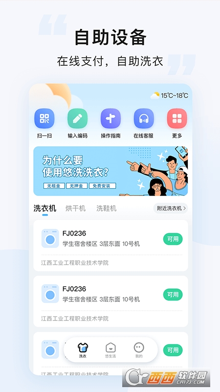 悠洗智能洗衣平台是一款智能共享洗衣软件,在这里能够搜索附近的洗衣设备,进行租赁扫码洗衣服,包含了校园洗衣服,所有的洗衣机采用了智能消毒功能,还可以自由调节洗衣模式,扫码即可使用哦!
