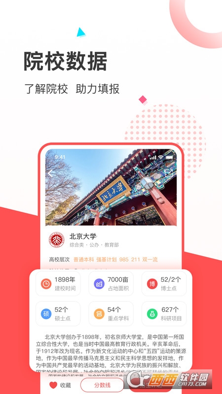 专门针对即将报考本科及大专院校的所有高中备考生关于高校推荐、志愿填报、分数线查询、院系介绍等功能融为一体的高考应用,此款应用凝聚了团队所有人的血汗,用心打造的能帮助您准确选择高校的应用。