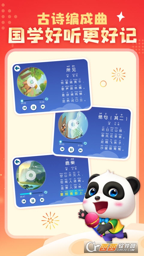 【宝宝巴士汉字】里的古诗包含《咏鹅》、《小儿垂钓》、《题西林壁》、《回乡偶书》、《小池》、《悯农》、《静夜思》等。将古诗编成儿歌,教宝宝边唱边背,记住古诗。