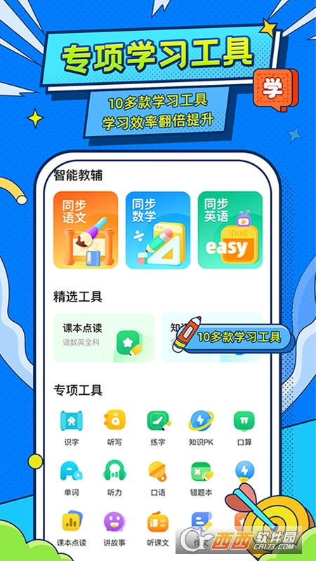 3、配备识字、拼音、口算、听写、听课文等10多个与教材配套使用的专项辅助学习工具,随时随地协同练习更高效;