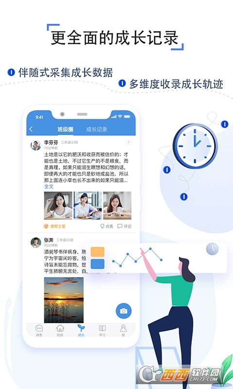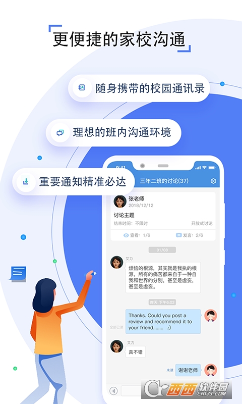 4、多方沟通:教师、家长可快速创建备课组、育儿组等,围绕教学、教育实时交流;还可随时随地进行班级圈分享、互动,孩子在家与校穿梭时的学习和生活状况尽收眼底