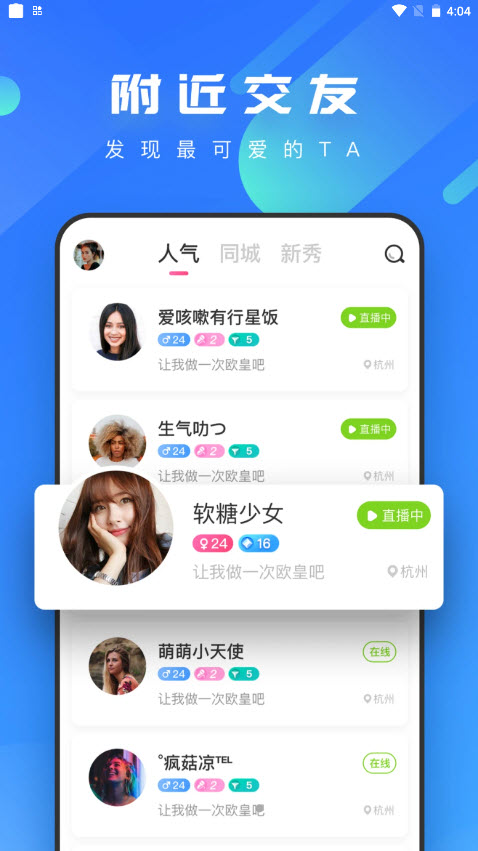 1,同城交友,你可以一键进行定位的,能够快速的找到同城的美女主播,并且还可以看到附近相关的活动。