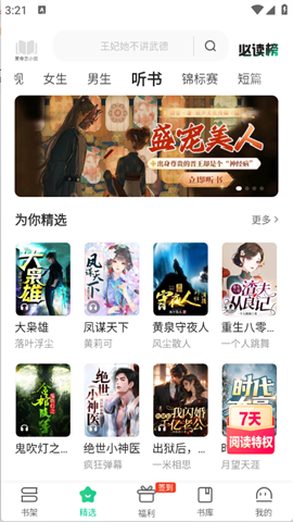 2、解放用户的双眼,可以选择听书功能,随时都可以享受自己喜欢的小说。