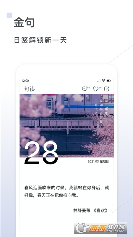 句读软件(美言美句大全)是一款句子阅读软件,在这里能够为用户推送每日好句子和美图,并且可以查看当前的日期,拥有的句子类型比较多样化,用户可以在这里评论收藏,需要的伙伴,赶紧来鳄斗163手游网吧!