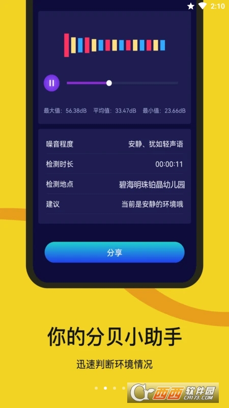 噪声检测器是一款噪声检测的软件,适合于各种检测声音的伤情,能够让用户了解到你附近的声音是否过大,对自身在日常当中的工作、睡眠以及学习产生相关的影响,如果你觉得周围的声音过于吵闹影响你的睡眠的话可以尝试一下这款噪声检测器!