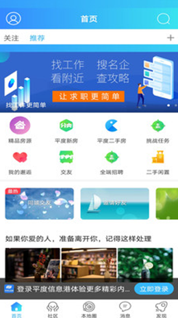 1,平度信息港app中将本地的社区模块建立了很丰富的内容,不仅有本地的服务资讯更新,还有对应的不同经营分享,关注人才和房产生活,便于自己的生活。