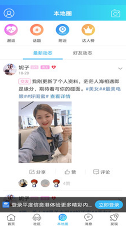 2,感兴趣的交友圈子可以看到同城的其他用户发布的最新动态信息和资讯,足不出户就可以了解最新的新闻和动态,还可以发现城市的商机,开始进行工作和创业。