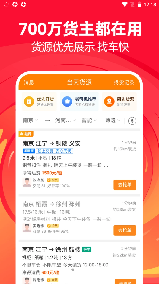 运满满货主app给每个货主们都带来了非常便利的物流管理服务,我们这里有非常多的货运汽车哟,直接在平台上就可以找到不同的货车发货信息,所有的货车都是平台官方认证的,大家可以相信我们!